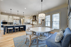 Soft tones and timeless pieces ensure that the kitchen, dining and living areas in this new English home work harmoniously as one