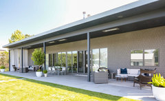 A main house’s patio uses a wall of the property’s secondary unit to help create a private outdoor living space