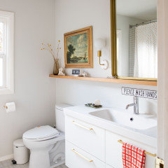 A custom wood vanity, aloe green tiles and brass details add color, texture and warmth to a once drab and boring space
