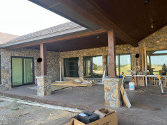 A new porch in Atlanta features an outdoor kitchen, a dining room and a living room with a fireplace