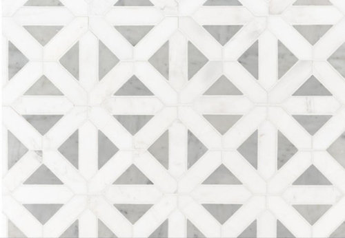 A designer leans on marble tile in various shapes and sizes to deliver a light style with tons of visual interest