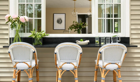 A window between the kitchen and an outdoor dining area makes easy work of entertaining alfresco