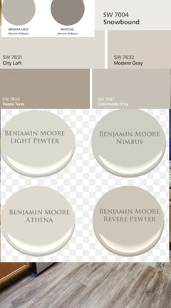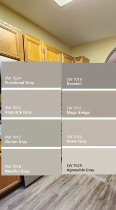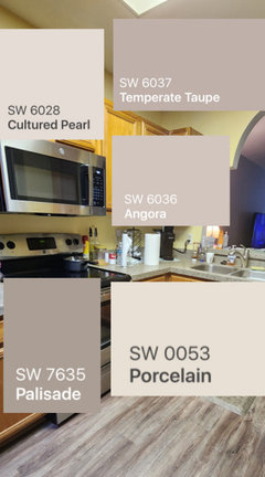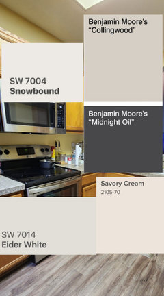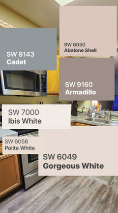 wow I think Beth gave some great ideas. It is hard to see the countertops and backsplash but I think the example she posted with the Revere Pewter looks so nice to me, and I dont usually care for grey. Also some of the offwhites look quite nice.