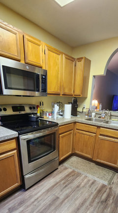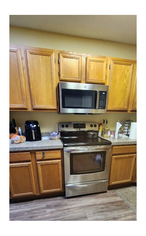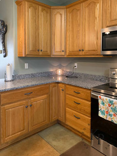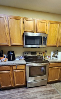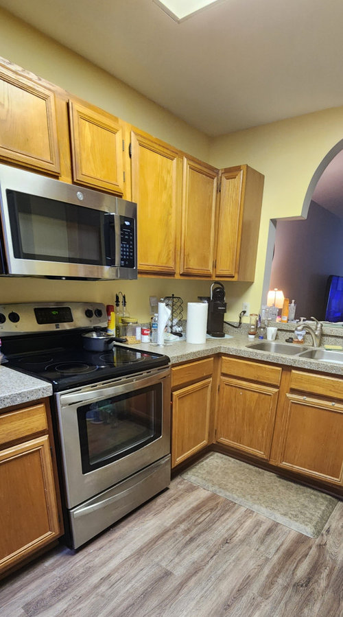 Original Author2 years agoHere are some better pictures. I'm just looking for the least expensive way to refresh the kitchen. I am in the process of cleaning the cabinets. I have completed the uppers. Please excuse the clutter. The floors and countertops will stay. We don't plan to move anytime in the next 5 years, but we may at that time so that is a consideration with any changes we make. Thank you for the positive responses.
