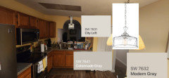 @MG I like your countertops! They coordinate very nicely with your stainless steel appliances. I like your plan to paint your walls SW Agreeable Gray and to get a new light fixture. You asked for color suggestions to go with your gray appliances, countertops, and flooring. I love evergreen with gray. Whenever I see it in nature, it is so beautiful to me. I wonder how you would feel about SW Jasper, at least for the base cabinets. If you want light upper cabinets, and you are painting the walls Agreeable Gray, why not paint the uppers that color too?