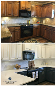 We want to update our 90's honey oak kitchen cabinets by painting them. What color works best with these granite countertops, vinyl flooring and stainless steel appliances? I know white is the in thing, but some of the whites I have seen have been quite stark. The wall color is Sherwin Williams Butter Up. UPDATE: Someone with experience will be doing the painting.