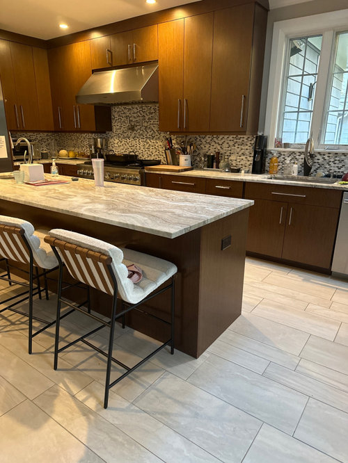 A designer balances a kitchen’s chic quartz wall and sculptural island with warm-tone cabinets and gray-washed floors