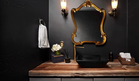 Going dark in the bath amps up the drama and lets metallic finishes shine