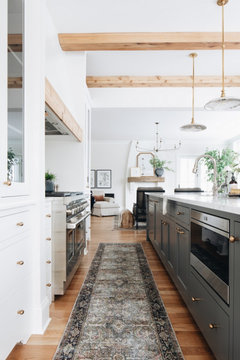 A smart floor plan and a timeless look create an inviting kitchen in a narrow space for a newly married couple