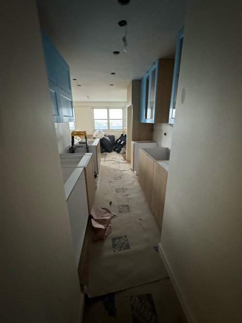 A boldly graphic wall and soft blue cabinets create a colorful focal point in this spacious new Washington, D.C.-area kitchen