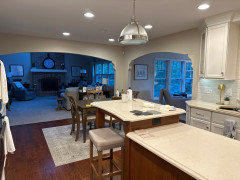 Warm wood cabinets, a reconfigured layout and wave-pattern countertops complement the home’s wooded surroundings