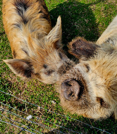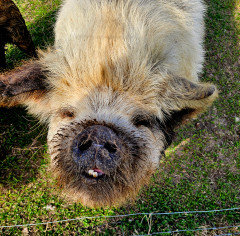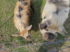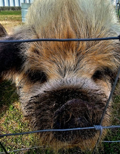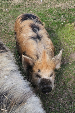Thank you. Penelope is a New Zealand variety of pig named Kunekune. It literally means fat and round lol. Very docile sweet pigs.Even the boars which can get 400 lbs. The meat is red like beef and makes the most awesome bacon you ever had. Its very expensive meat that chefs like to use. Like I said before Penelope wont be going to freezer camp lol. She is a mascot here. So is her mother. Her little friend is a boy but too young to breed and too closely related to her. He's a nice boy and will be going to another home. We will be getting another unrelated registered boar this spring. Kunekune pigs don't typically breed until 15-18 mos. Our first pair was 18 mos. This little friend piggy is in Penelope's pen because he thinks he can get more special treats and has been getting out of his pen and running around the yard. I'm glad he likes her pen and is no longer getting out lol. Penelope was one of my bottle baby pigs.