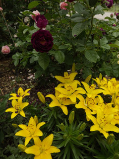 With Twilight Zone. All the roses and other large plants block the view of the short lilies in bloom, unless you are standing in the middle of the flower bed. TZ wants to be the center of attention as usual.