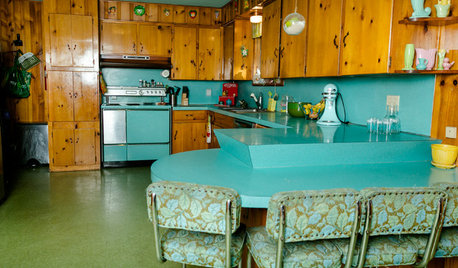 A kitsch-loving Texas homeowner enjoys her original teal countertops, knotty pine walls and pink-and-green-tiled baths