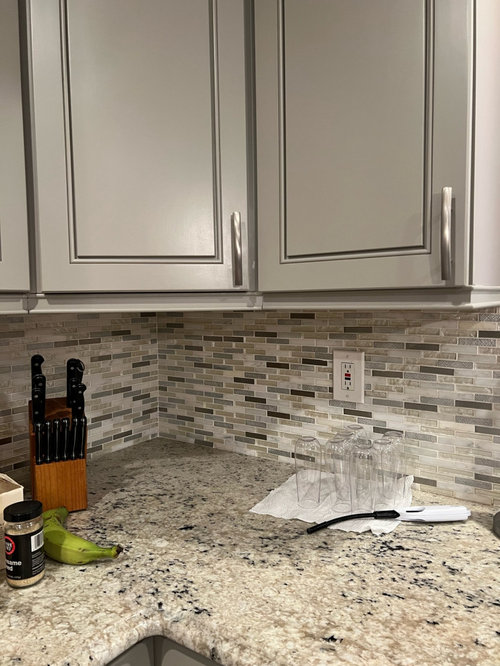 Two-tone cabinets, vibrant fabric and a frosty backsplash brighten this eat-in kitchen