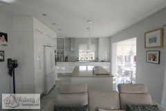 Pros replace cabinetry with tiled walls, striking focal points and expansive windows