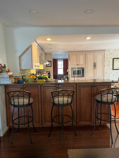 2) Update to cabinet colors in DR: I have a wall cabinet (7’ x 5’ 8”) and under counter bar cabinets (8’ 3” x 3” 8” (which I do not want to remove as both provide valuable kitchen storage.) I'm pretty sure I need to change the color/style of cabinets here, especially on the wall! lol