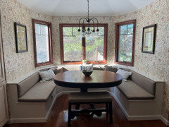 As you can see my kitchen is quite small, but very functional for us. No need to change the layout. I just would like it to be updated so the design flows nicely with the rest of the house, Specifically DR and LR.The seating banquet and the wallpaper will stay as they are one of my favorite spaces in house after my newly designed LR. It also serves as a cozy gathering space for friends when we entertain large groups.