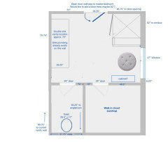 Toilet:It would be difficult to move the toilet very much, and would probably require opening walls and ceilings below that we just rebuilt. My husband and I do get ready for our day or bedtime at the same time fairly often, and since the closet is in here, we'll need to come through. Privacy for the toilet is very important to my husband, and I can't imagine him agreeing to no door. We could maybe change the orientation though, and change the shape of the closet. Our master bath is currently down to the studs and the toilet is removed, which makes it hard to mock up how the space would feel with the smaller area. I definitely hear the concerns about the size of the space and accessibility, and I don't want to make a short-sighted choice.