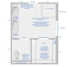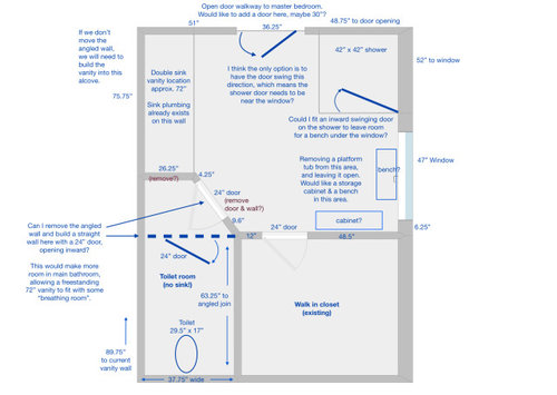 I would love some advice on some floor plan changes we're considering for our master bathroom renovation. We would like to save on costs and not move the general locations of the vanity, shower, and toilet.