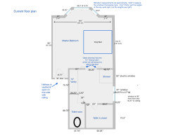 ETA: I forgot to label the length of the left hand wall in the water closet from the back to the angle, where we are considering moving the door. That's 63.25" from the back to the angle. I think the wall behind the toilet is thicker than normal due to duct work back there, so it doesn't add up exactly as compared to the size of the closet. The space on the opposite side of the closet and WC wall is open vaulted space above our living room, so not available to build out through it.