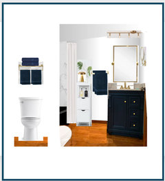 A designer works with her clients to create a teal accent wall and a vanity with custom storage cubbies