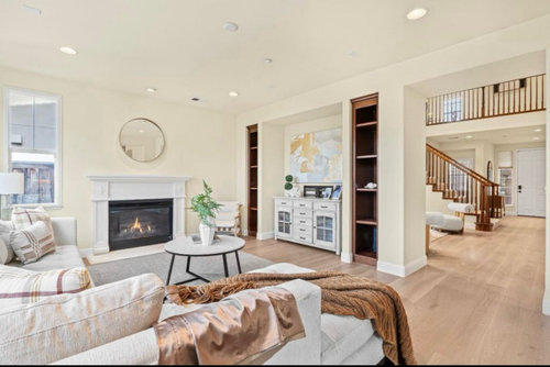 Creamy white and beige paints, wood ceiling beams and wood-look flooring refresh a once-dated space with inviting style