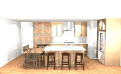 A hand-painted hood, a brick fireplace and patterned porcelain tiles add classic charm to these renovated kitchens
