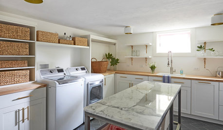 A Chicago couple recycle kitchen cabinets and a marble-topped island in their storage-rich laundry room