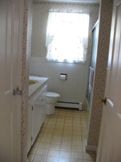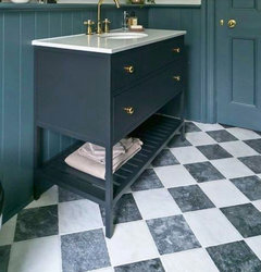 Add movement, definition and interest to a humble bathroom floor by sidestepping uniform tile in favor of an unusual design