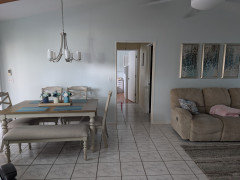In this modern home, a galley kitchen opens up and connects to dining and family areas with a roomy bamboo island
