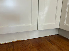 These are the 3 year old toekicks for my wood mode cabinets. I had issues with the cabinets immediately after I had them installed. The cabinets may be wood, but the toe kicks and supporting pieces are laminate covered particleboard or something of that sort. I have a normal kitchen and despite multiple contacts with the company they will not honor anything related to the workmanship as they state it is “excessive water “ which makes no sense. I have hardwood floors in my kitchen, so there is no excessive water used in cleaning them. The customer service is nonexistent. They never came out to look, and as I escalated to the manufacturer, they simply forwarded emails that they had internally from the distributor to the manufacturer. This is the toe kicks as well as pieces of the cabinets where they are mounted to my countertops.