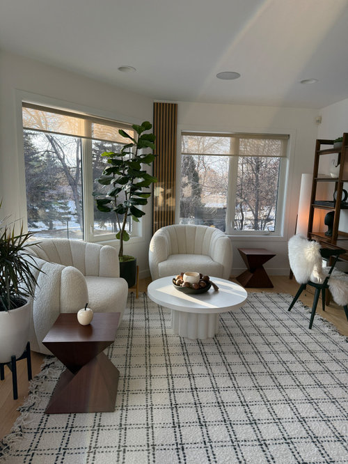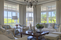 This stylish 3-season sunroom in the Detroit suburbs connects to the lawn and the sparkling lake beyond