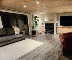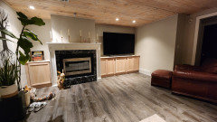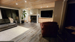 Stone and wood plus earthy colors link a family room to its woodsy site and create a comfy gathering spot