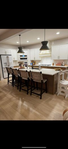 A smart redesign gives an active family a modern kitchen with soft tones, natural elements and mixed metals