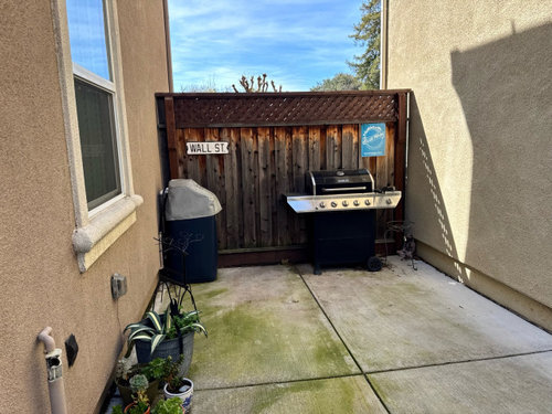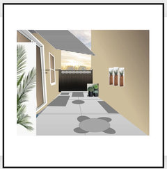 A main house’s patio uses a wall of the property’s secondary unit to help create a private outdoor living space