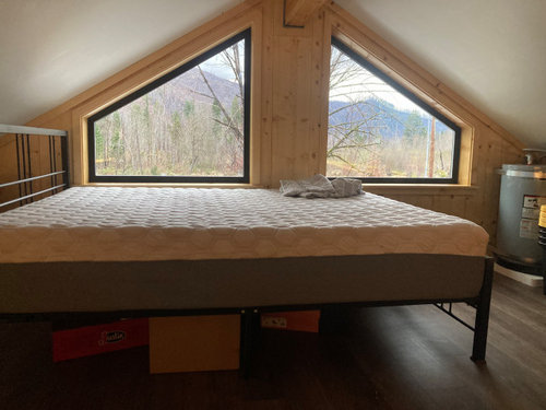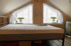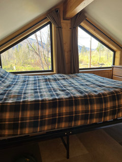 Need ideas for triangular window coverings in this loft bedroom.