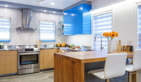 KITCHEN MAKEOVERSBlue and Aqua Cabinets Make a Splash in a Colorful Kitchen