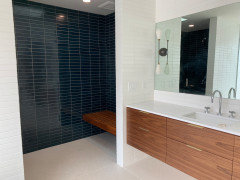 I have a shower like this that we put in 2 years ago… it’s 4 feet wide by 9 feet long. I do love it and it is beautiful, although it is big! Each end has its own fixed showerhead along with a sliding handheld. I liked the idea of keeping the back wall clean with no niches, so those are tucked in the front pony walls with the Kohler grab bars above. Each side of the shower has its own water controls, also on the inside of the pony wall. I also vote for the bench being along one width of a wall and not the corner. One thing to keep in mind is you need a powerful vent if you have multiple showerheads. We had the contractor come back afterwards to upgrade. I also keep a tall mop like squeegee in my shower for cleaning. We also made sure the doors were wide enough for potential wheelchair usage – – the bath is on the first floor and the bedroom door is wide enough for a wheelchair. I think we went 30 inches on the shower door, when you get into that size glass, there are special requirements.
