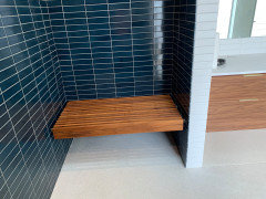 Agree with the bench. I just bought one from Aqua-Teak that has a storage shelf and some raised "handles" . Teak wood is warmer than tile / solid surface bench and infinitely more flexible. - 9 months ago