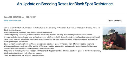 Register at Rose.org to get the latest on Blackspot research from Dr David Zlesak. Dr Zlesak is known worldwide for his expertise and research on Blackspot. He is a great speaker and you will learn a lot from this program. Program is free for members - $5 if not a member. Become a member of the ARS today to enjoy educational programs and so much more!