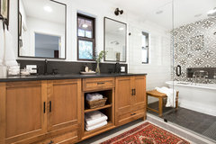 A designer and a builder loosen up a layout with a freestanding tub, bright palette and glass-enclosed low-curb shower