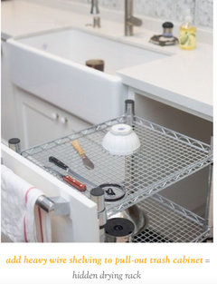I like the drying rack cabinet but wonder how to keep the drips above the sink rather than into the sink, on the counter under the cabinets where sink is not and behind the sink. A bottom slightly funneled above the sink would be perfect with a rack just above it and then the other shelves being racks. I am not sure how to design the slightly funneled bottom. It would look best raised behind the front face of the cabinet frame like some projects that want under cabinet lighting without light molding applied, so the odd bottom is hidden.