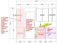 Below, the narrow shelf to the left of the sink can store little stuff, and the full height of 24" deep cabinet to the left of the door to the dining room can store big stuff. If they want, they can have counter space in the full height cabinet by leaving the middle section without a door. It would look like a tall cabinet where a wall oven is to be installed, but there is no wall oven. The counter space in the "wall oven space" can be useful, and the 24" depth above it can store big stuff. The corner cabinet is 36"x36" so that the opening can be about 15" wide, and they can store medium size stuff there.