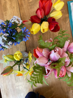 This is our daughter with special needs who lives in a grroup home. She visits Sundays and likes to bring a bouquet back with her. we just gravitated towards tulips because they are so varied and colorful. Also relatively inexpensive at end of season. Heres a photo of a Mother’s Day harvest which comes before the 19th. Some years I miscalculate and the tulips are finished by May 19. . Theres always something in bloom we can make an arrangement with. i never try to save the bulbs. We just buy new ones every year,