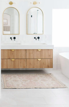 A fresh palette of white, gray and brass pairs with a floating vanity to keep things feeling light and airy