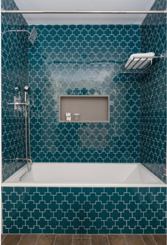 See how designers enhance the classic space-saving feature with tile color, vanity style and other design details