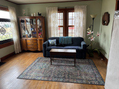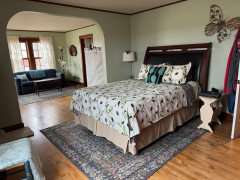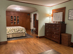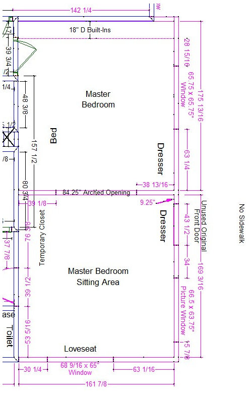 I do plan on taking quick measurements of the rest of the first floor and probably some pics. Here are 2 views of my Master Bedroom which I happen to have in my phone already. This shows why we should not move doorways. Again, this is a 1918 farmhouse and the Master is the original dining room and the sitting area is the original living room. We absolutely love our Master suite. Eventually, the Master Bath will be through that door by the blue loveseat. Right now it is the office with the tiniest closet converted to a bathroom from a few owners ago. The door from the kitchen is the doorway on the right of the bed. Behind the camera in the first pic is floor to ceiling built-ins that we use as closets.
