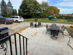 -There is no garage yet. We park our vehicles on the top of the hill across the driveway from our large cement patio. It's all gravel. Guests park along the long driveway. The patio has a grill, large metal table w/ chairs and other patio furniture. Some day we will add a 2-car detached garage w/ garden shed storage across the driveway, because we have a huge garden and fruit trees across the driveway from the Original Sunporch. Attaching a garage would mean cutting down the largest, most beautiful tree on our property and rerouting our whole driveway which requires digging into the hill and building a retaining wall. Our septic runs under the lawn on the South and West sides of the house. The cons outweigh the pros. In very bad winter weather or predicted hail, we currently park our vehicles in the huge shop further away from the house.