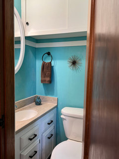 Wowee, that is one tiny powder room! Love the turquoise walls though. I love the old red faded barn wood on the back of the peninsula and that big beam too!